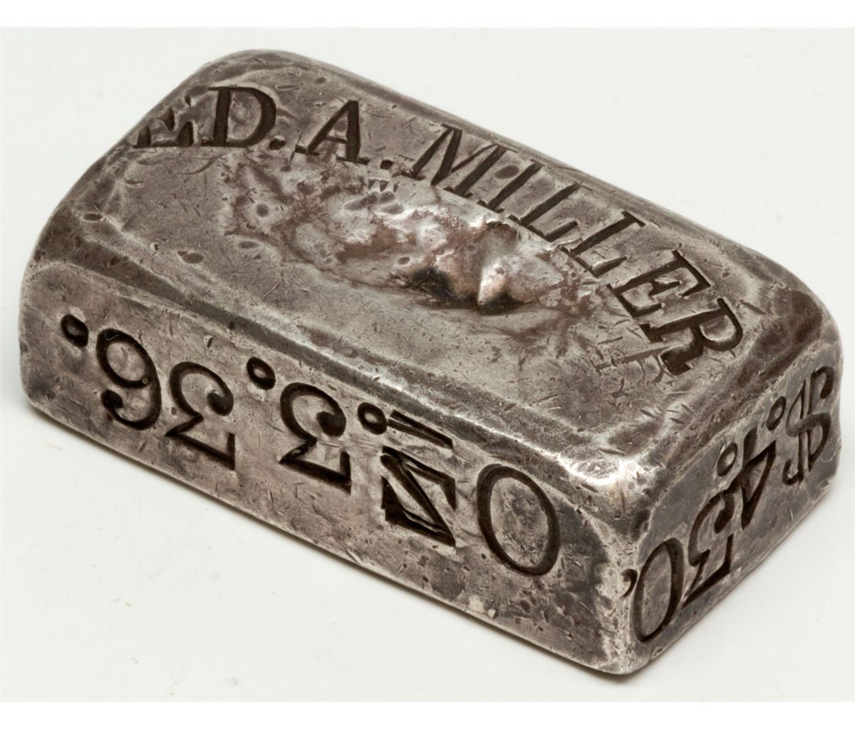 [06/2012] https://auctions.stacksbowers.com/lots/view/3-5X3HE/undated-ed-a-miller-silver-ingot-336-ozs-430-value-ed-ja-30-1864-on-back-of-ingot ($7,050)