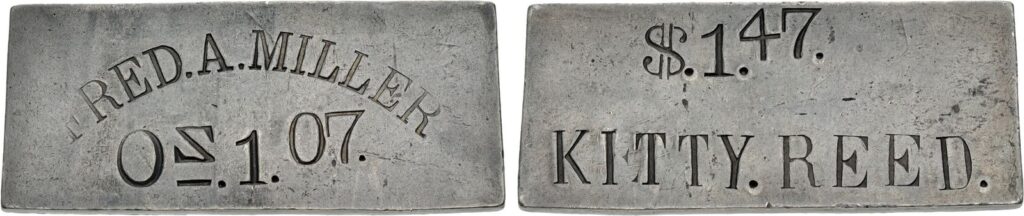 Undated (1863-1865). The bar reads: FRED. A. MILLER in a pre-formed logo punch in an arc at the top of the bar / OZ (retrograde Z). 1.07. in two lines below on the face. $.1.47./ KITTY. REED. in two lines on the back. The ingot itself measures 54mm wide, 23.5mm tall, 2mm deep, 33.13g. . Extremely rare. Tell-tail signs of authenticity include: Fred A. Miller logo punch is in an arc with the periods shaped as trapezoids, and the Z in OZ is retrograde and underlined.