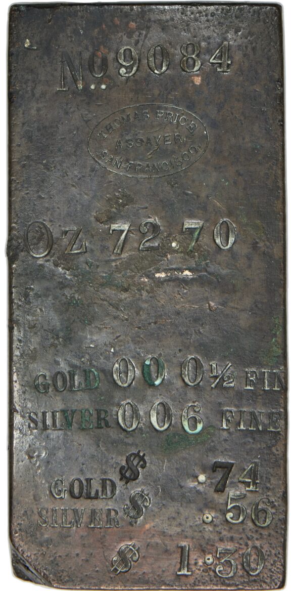Thomas Price Assayer Ingot. 72.70 Ounces. 23 mm x 74 mm x 155 mm. Mixed metal ingot with low gold and silver content. The front of the ingot is laid out vertically: No 9084 / assayer’s oval hallmark / OZ 72.70 / : GOLD 0005 FINE / SILVER 006 FINE / GOLD $ .74 / SILVER $ .56 / $1.30. Thomas Price was born in Wales in 1835 and moved to San Francisco in 1862. Price worked for many years in San Francisco as an assayer for Kellogg, Hewston & Co., and taught chemistry the San Francisco City and Toland Medical colleges, per rareingot.com. In 1875, he founded his own firm, and a decade later took on his son as partner. Thomas Price ingots are rare and were made from before his son came on board as partner. Most are silver or mixed metal, but one gold piece is known. Additionally, a small mixed metal ingot with very small parts silver and gold has been documented and described as unique. The present offering changes that. This piece is massive for a Thomas Price ingot, and it is another entry in the class of low gold and silver content ingots. The base alloy of the ingot is unknown, although it likely contains substantial amounts of copper, as per the color and weight. This is a magnificent piece worthy of the most advanced assayer ingot collection.