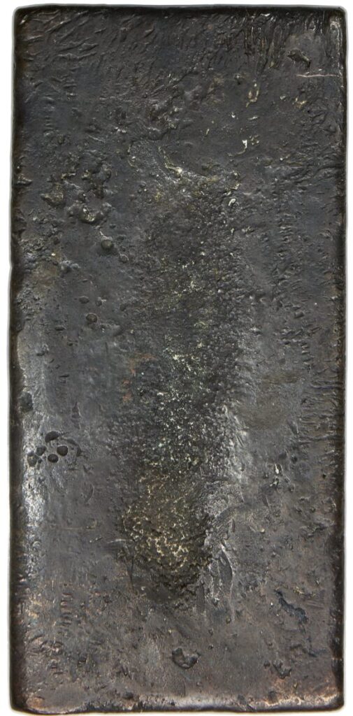 Overall appearance of Fine. A very rough and somewhat misshapen little ingot. Quite dark silver gray in color. This is a most unprepossessing bar but the complete ethnic (the assayer’s bullion punch) makes it quite important. This bar is not terribly well formed, being thinner on one side than the other, and it hasn’t been well finished. It has the look of a bar that was not meant to be around long, certainly not to be saved as a presentation piece.